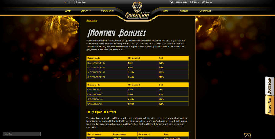 The welcome offer of Golden Lion gives two types of deposit matches – one meant for slot play, and the other meant for card games. The slot welcome bonus gives a 300% match, and if a player uses it, they can claim a 300% follow up deposit match. If you fancy card games more, you can deposit a minimum of $25 and receive a 125% match bonus.